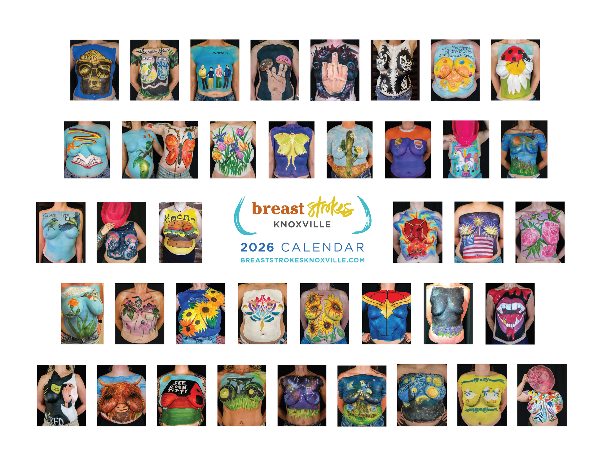 The 2026 BreastStrokes Calendar was lovingly curated with images from the 2025 Paint Days and from our 2024 Punk Rock Flea Market pop-up. Each image represents the selfless love and dedication of our models, artists and volunteers, and have helped raise more than fifty thousand dollars in support of East Tennessee women living with cancer through the years.
